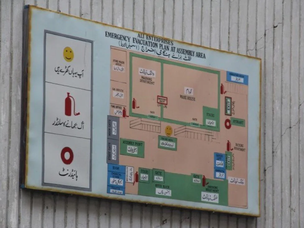 A sign board at the factory explaining the evacuation plan in case of emergency. PHOTO: AYESHA MIR/ THE EXPRESS TRIBUNE